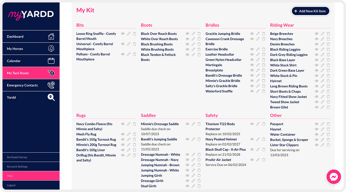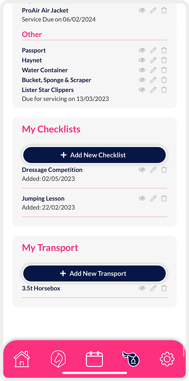 Store all necessary information about your equipment for easy access. Set reminders to replace your riding hat, book saddle fitting appointments, service your clippers and much more!